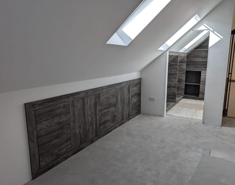 Behind the lower bank of doors are a mixture of cabinets and drawers, which have been built into the void of the roof space. You will also find some hanging and shelving are in the room further forward, which has been manufactured to the shape of the roof space, maximising storage for our client